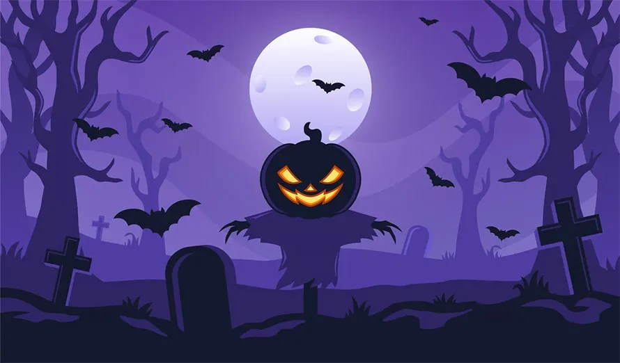 A spooky Halloween illustration featuring a glowing pumpkin-headed scarecrow standing in a dark graveyard under a full moon. Surrounding the scene are eerie trees, bats flying across the night sky, and gravestones that add to the mysterious atmosphere.